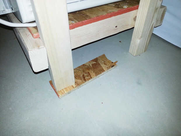 Ya no tengo niños pequeños en la casa, pero tengo adolescentes y un joven, por lo que no quería que todo el asunto para caer sobre alguien. Lo puse en un espacio estrecho, por lo que si se cae, no pasar todo el camino. Sin embargo, si usted tiene niños pequeños, definitivamente debe asegurar todo a la pared para evitar una volcadura. Si no tienes niños pequeños, como mínimo, calza las patas delanteras para que el estante entero se inclina ligeramente en la pared, que significativamente ayudará a prevenir volcamiento cuando se cargan los estantes. Usé el desecho del OSB ajuste para, como se muestra. Compruebe con un nivel, una vez más, es muy importante para asegurarse de que no caigan sus estantes.