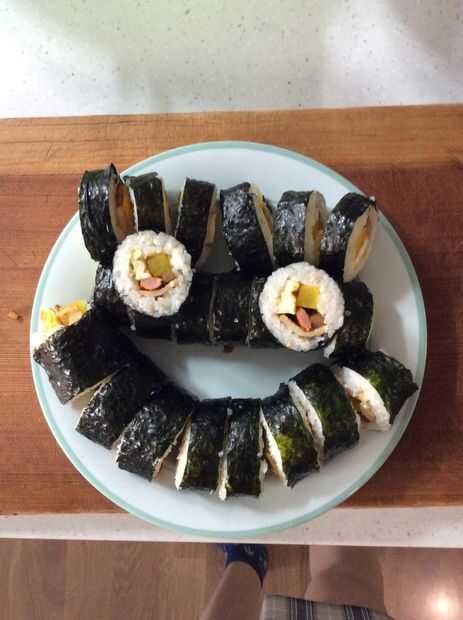 Kim Bap es un plato coreano que tiene algas, arroz, carne y verduras como zanahorias, espinacas. Su clase como brocheta sin el pescado crudo.Paso 1: Paso uno.Pasos1.) Coloque el alga secando en el rodillo de bambú.Paso 2: Paso 2.2.) ponga arroz cocid