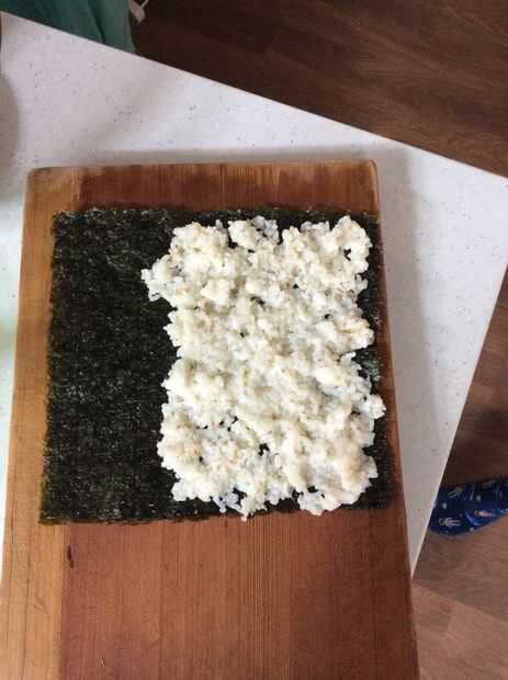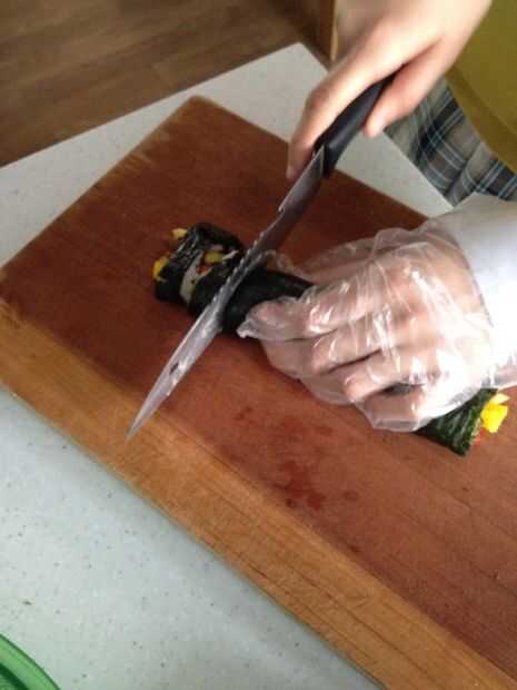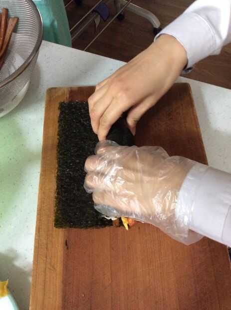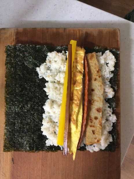 Poner las algas en una tabla de cortar limpia y poner el arroz sobre las algas. Luego se extendió el arroz. Dejo algunas de las algas expuestas. Ponga los otros ingredientes en el arroz. Rodarla. Utilice sus dedos para extender el agua en el borde de las algas. Cortar el laminado gim BAP.