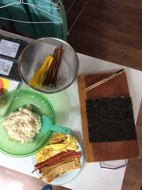 Kim Bap es un plato coreano que tiene algas, arroz, carne y verduras como zanahorias, espinacas. Su clase como brocheta sin el pescado crudo.Paso 1: Paso uno.Pasos1.) Coloque el alga secando en el rodillo de bambú.Paso 2: Paso 2.2.) ponga arroz cocid