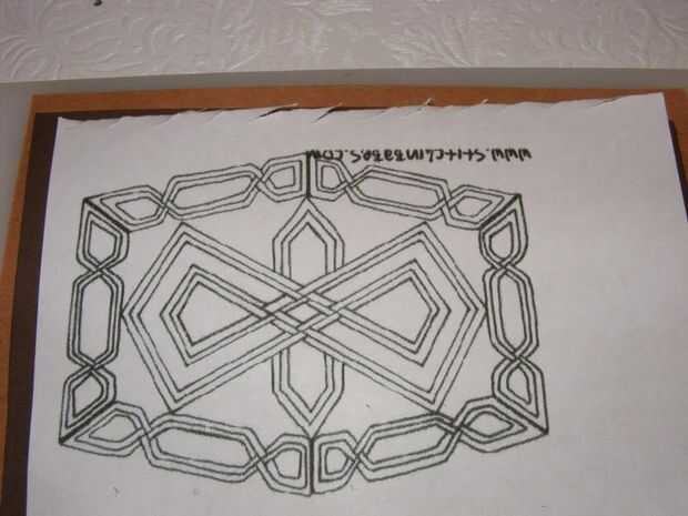 El fondo para el diseño en forma de hacha, el detalle para el diseño de la hacha y las volutas de la frontera también fueron cortadas de la espuma del arte.