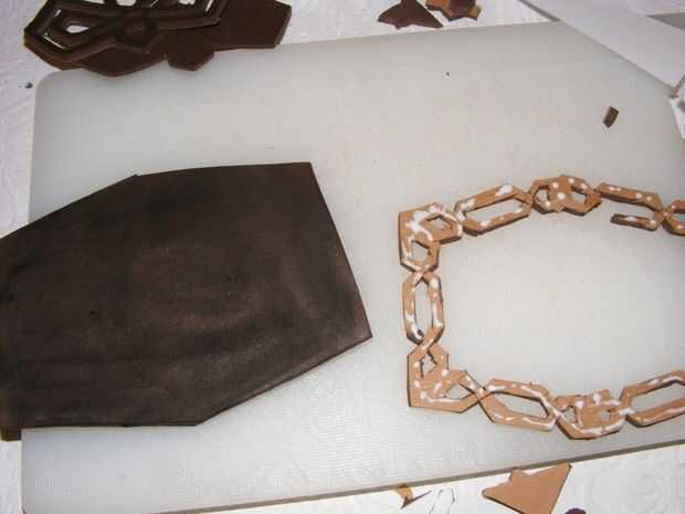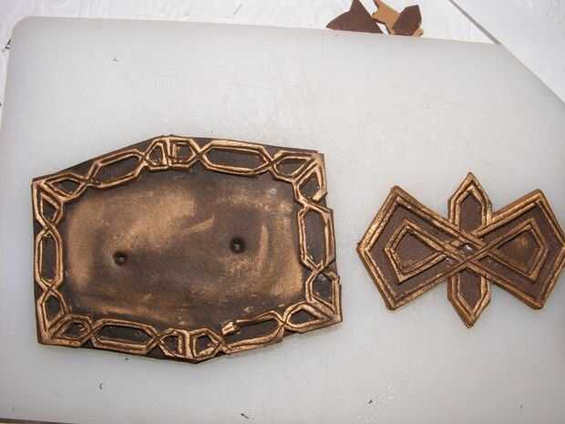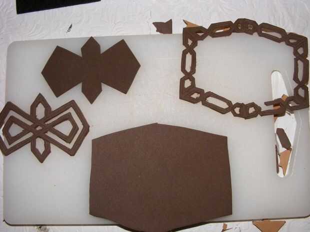 Hice una pieza base de 3 mm de espuma de arte había montado en fieltro rígido, había planchada en cuanto a las otras piezas de la espuma y luego había manchado con rotulador de la tela negra y Rub & Buff.