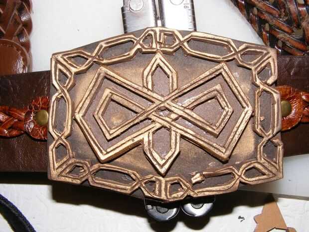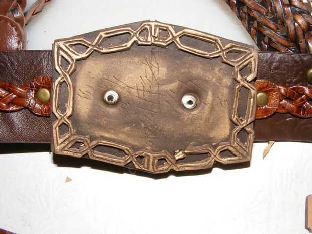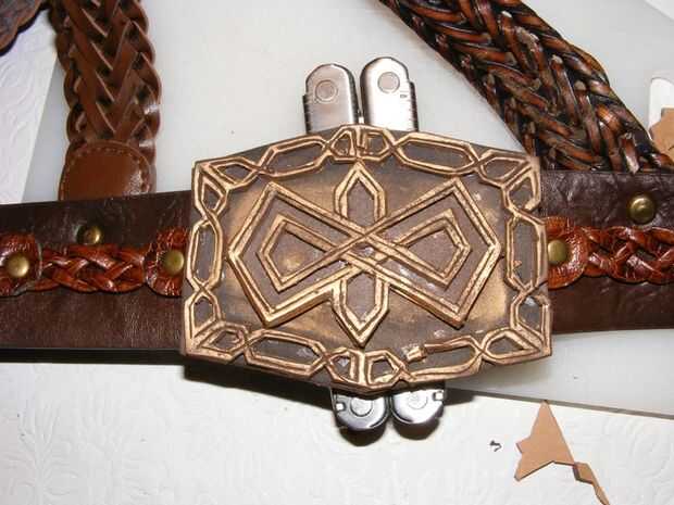 La base fue asegurada al cinturón con remaches de la tapa. El diseño del hacha y las fronteras eran pegadas a la base con pegamento adhesivo y deja secar.