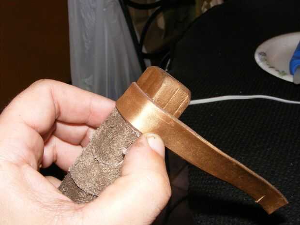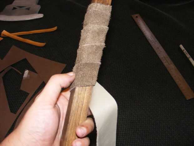 Para montar, la cuchilla se deslizó en su ranura y asegurar con pegamento caliente. Asimismo fue asegurado el remate. Las decoraciones fueron pegados en su lugar en la hoja y el mango. El mango estaba envuelto con cuero (donado gentilmente por mi amigo Scubabubba), y luego los "accesorios" de espuma estaban pegados en su lugar. Creo que resultó mirando bastante agradable, lo proyectos de idea de último momento.