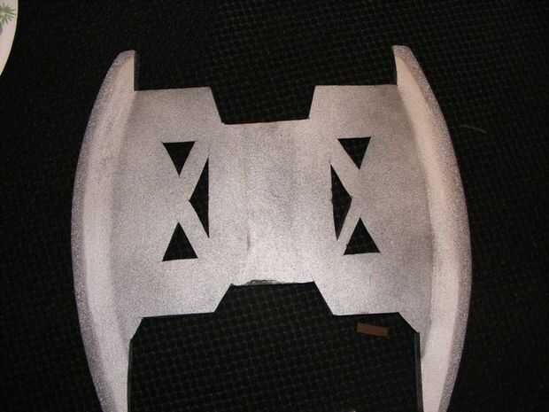 Cortar la forma de la hoja de hacha de la espuma con un cuchillo de la manía, luego lijar el borde un poco para darle un mejor contorno. Utilicé una lijadora de Palma y papel de lija de grano mediano, pero se podría lijarlo con la mano así. Base pintada la hoja negra, luego dio todo una capa de plata. Por último, los bordes de la hoja se enmascararon apagado con el papel y el resto de la hoja fue sacado el polvo con pintura negra.