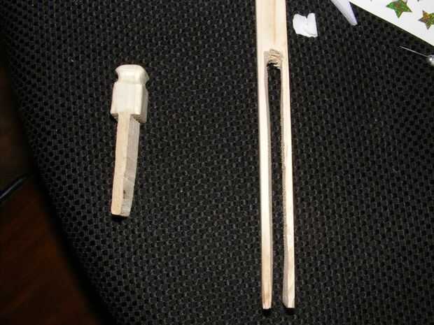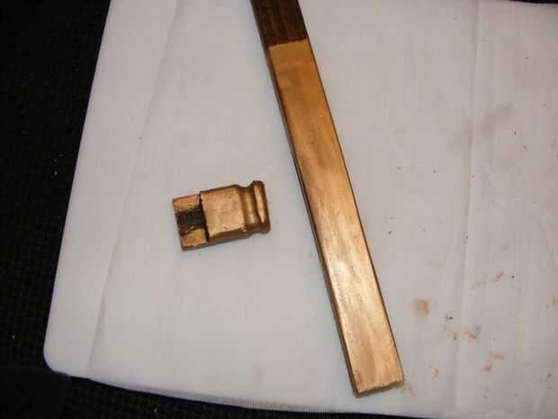 El mango se hizo de un trozo de pino amarillo mide 1 "x 3/4"x 48". Esto fue sólo una pieza de corte que he encontrado en el cubo de la basura en la tienda de escena de Departamento de teatro de la Universidad. Corté una muesca del mismo espesor que la hoja de hacha en un extremo con una caladora y un taladro. También hizo una pieza de remate de la misma chatarra, utilizando una sierra de vaivén y mi herramienta Dremel para moldear la madera. El mango y el remate luego fueron teñidos con tinta para madera color nogal oscuro.