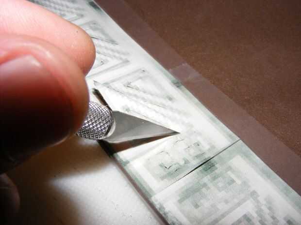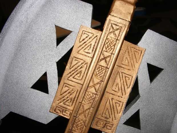 Espera de la mancha se seque, hice las piezas decorativas de 2 mm de espuma de artesanía utilizando la misma técnica de puntuación de entonces de hierro utilizada para muchas de las otras piezas en este Instructable. Los patrones fueron anotados en la espuma con la misma plantilla de la foto que yo había utilizado para la hoja de hacha. También hice un par de 1/2" ancho tiras para varios accesorios en la manija. Todos los bits decorativos estaban coloreados con frotar oro antiguo y Buff. El mango y el remate también estaban coloreadas con Rub & Buff en la parte superior e inferior (ver fotos).