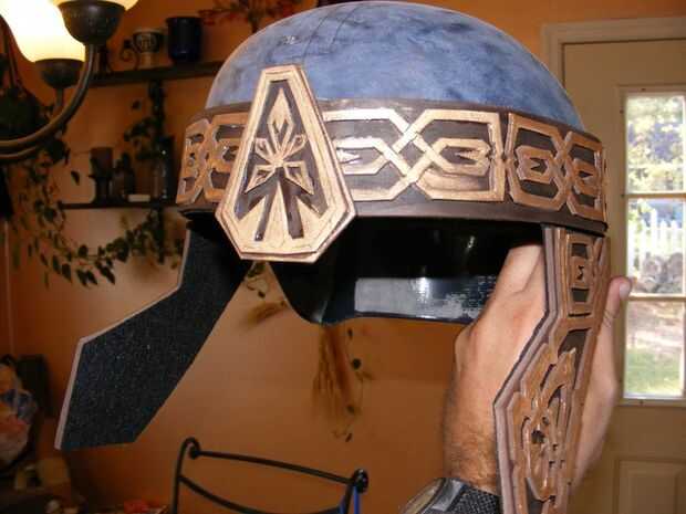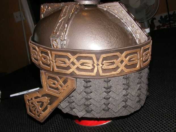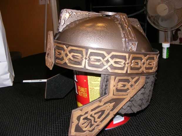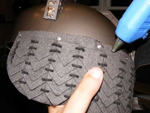 La diadema, cheekguards y medallón estaban simplemente pegados en su lugar con pegamento caliente. Las lengüetas de fieltro en la parte superior de la cheekguards simplemente bajo la diadema y aseguradas con un poco de pegamento caliente después de la parte posterior de la diadema fue unida al casco. Los cheekguards fueron también viró a la pieza de la falda con cola caliente.