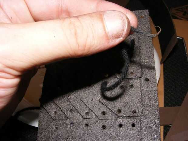 La falda del casco escala hizo cortar una pieza base fieltro rígida para envolver alrededor de la parte posterior del casco base. Dejé una extra 1/2 pulgada de fieltro en la parte superior para proporcionar un punto de Unión. Varias filas de escamas en forma de rosetón fueron cortadas de fieltro más y Unidas a la pieza base en la superposición de capas, usando pegamento caliente. La falda armada fue pintada con una solución de agua cola PVA de 50-50 y deja secar. Aproximadamente un tropecientos diminutos agujeros de cordón fueron perforados en los bordes de las escamas con un golpe de cuero, y adicionales agujeros fueron perforados en la pestaña en la parte superior utilizar para atar la falda después. A continuación, la falda fue pintada frente y parte posterior con pintura en aerosol bronce martillado. Una vez que la pintura se había secado, usé algunos hilo negro encaje a través de los agujeros de cordón de tropecientos.