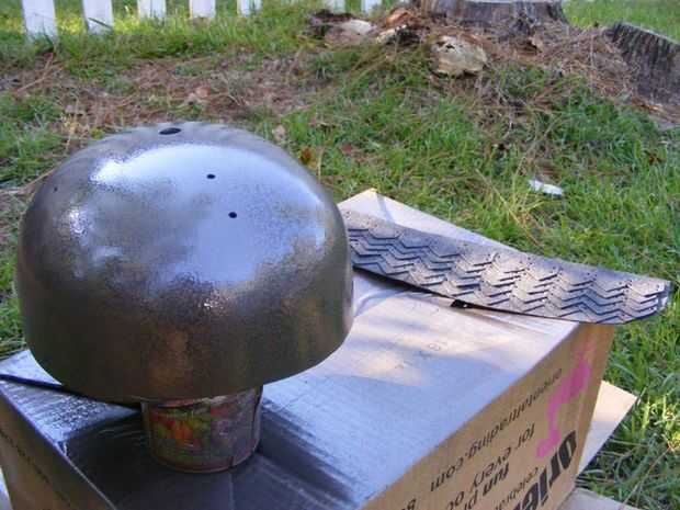 El casco base fue bien lijado para quitar brillo todas las aletas y el disco estaban pegados en su lugar con E-6000, se llenaron los huecos entre las aletas y el casco con una gota de pegamento caliente y todo fue pintado bronce martillado. Agujeros para remaches fueron marcados mediante orificios en la pestaña de la falda, luego perforados. Entonces la pieza de la falda fue montada en el casco base con remaches pop.