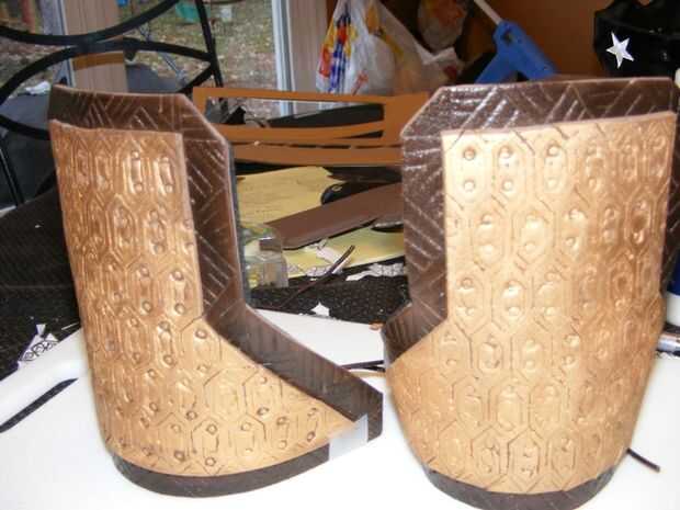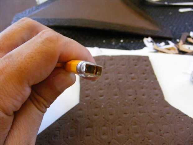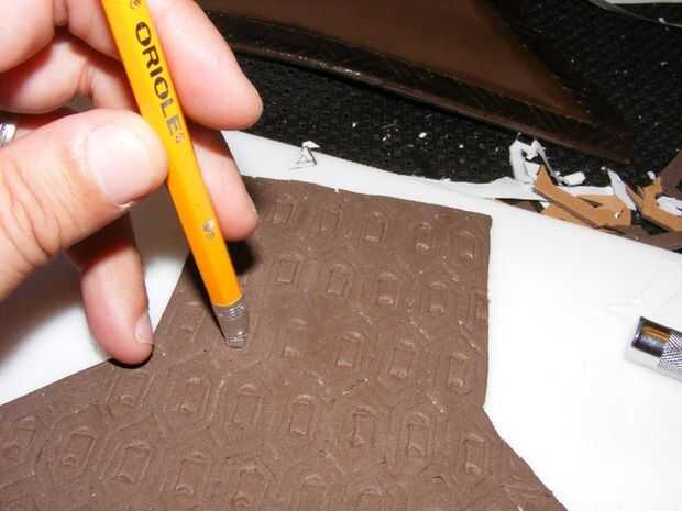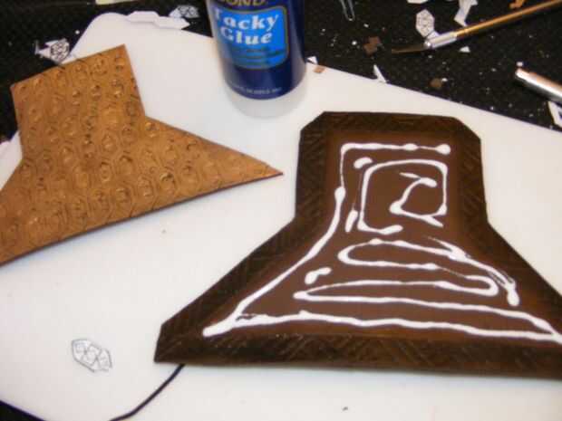 Las escamas de la armadura fueron cortadas luego de una segunda pieza de espuma de artesanía. En lugar de cortar individualmente cada escala, simplemente recorta el contorno y luego anotó las escalas más a través de la espuma. Los diseños decorativos en cada escala se presionaron simplemente en la espuma usando un punzón de cuero y el collar de goma de borrar (sin goma) de un lápiz. Algunos detalles fueron marcados simplemente con un cuchillo de la manía. Para obtener un poco más a los diseños de la película, formé el collar de goma de borrar en un rectángulo apretándolo suavemente con unos alicates. Los diseños resultantes de la escala son mucho más simples que los intrincados de la película, pero son una aproximación razonable.