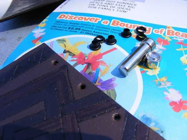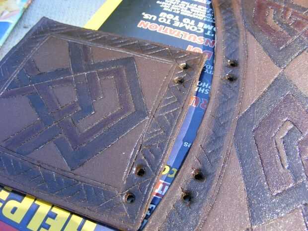 Cuando el Mod Podge seca, agujeros para ojales fueron perforados con un punzón de cuero, con agujeros más pequeños utilizados para encaje juntos la banda y la placa de la mano y agregar una cadena para ir a través de la palma de la mano.