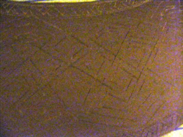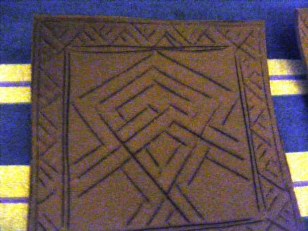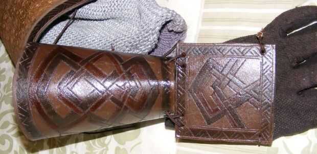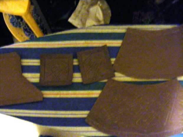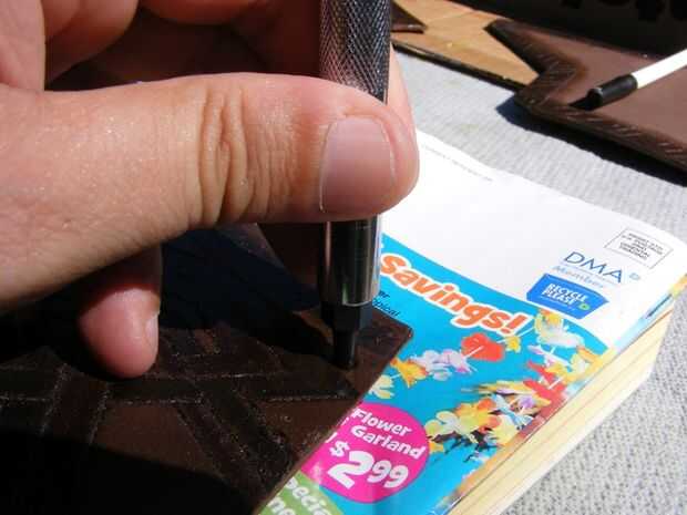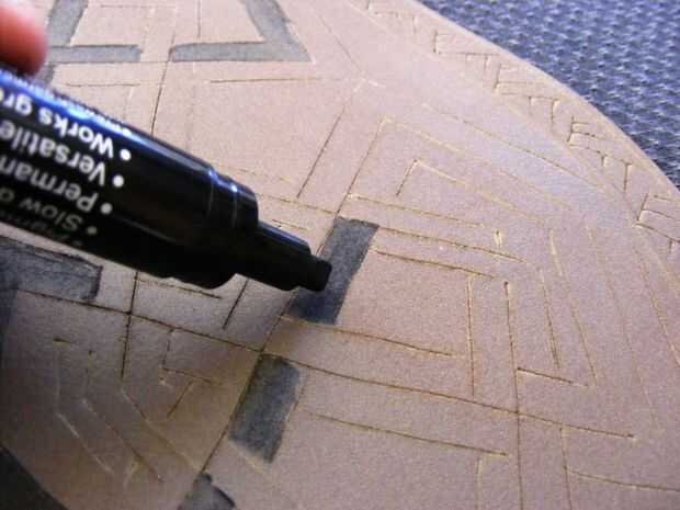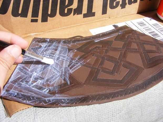 Los diseños estaban coloreados con marcadores de tela negro y marrón. Toda la pieza fue luego sellada con acabado brillo Mod Podge para que se vea más como el cuero.