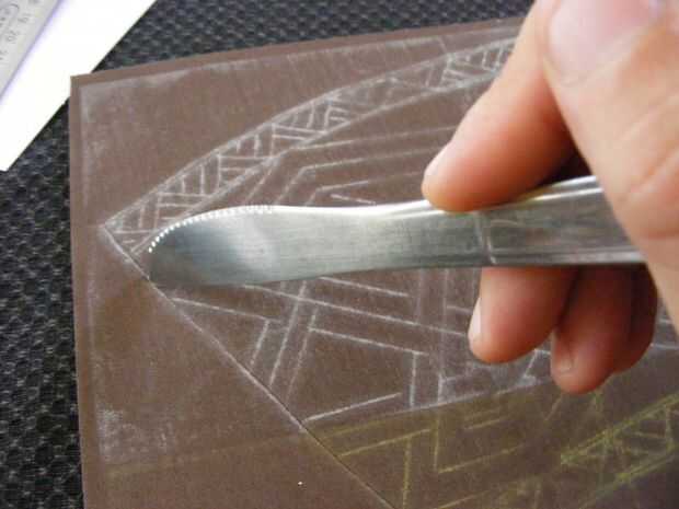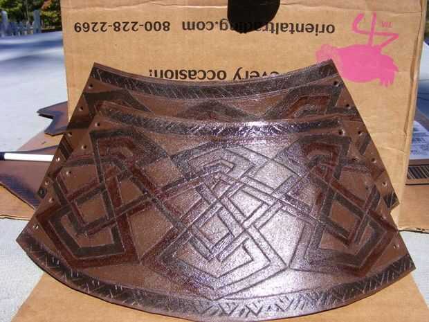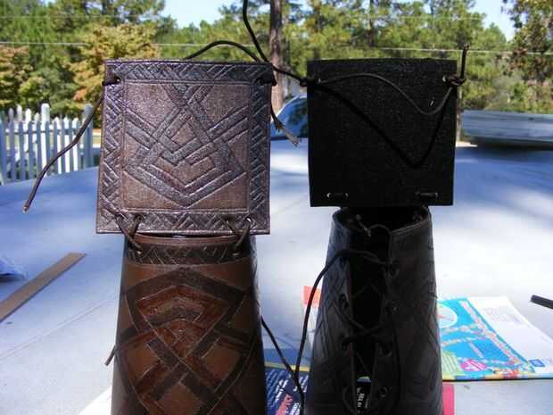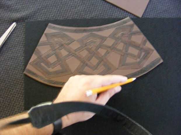 Imprimí los patrones y hacer modelos de papel con el fin de aproximar la escala. Una vez que la escala que quería, los patrones fueron transferidos sobre espuma de 2mm marrón craft por calco con papel de color claro. Los contornos de los diseños fueron anotados en la espuma con un cuchillo de la manía, y las piezas eran planchadas entre las hojas de pergamino y rociador montado sobre arte rígido sentía exactamente como las piezas del casco y los hombros.