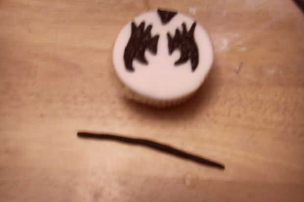 Rollo de salchichas largas, delgadas de pasta de azúcar negra. Acomódalos en longitudes diferentes para hacer el pelo.