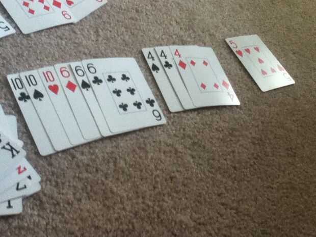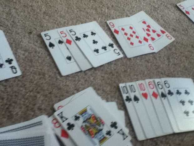 Este es un ejemplo de gin rummy el 5 solo es el 1 juego de los otros jugadores tarjetas usted puede sólo jugar de sus tarjetas si tienen un completo set que en este caso 3 5