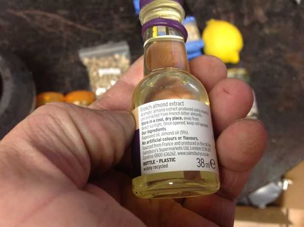 2g almendra amarga, ahora en el UK y Estados Unidos esto es un veneno enumerado por el cianuro contenido, que si usted puede conseguirlos puede utilizar melocotón amargo de los huesos si no entonces usted tendrá que hacer lo que hice y use un chorrito de extracto de almendra, pero asegúrese de que fue hecho con almendras amargas. También lancé en algunas almendras regulares para la buena medida.