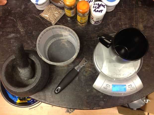 un mortero y mortero para triturar la materia para arriba, no quiere entregarlo al polvo por lo que no utilizar una amoladora eléctrica, puede usar una bolsa y una botella de vino si se pegan.
