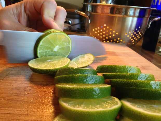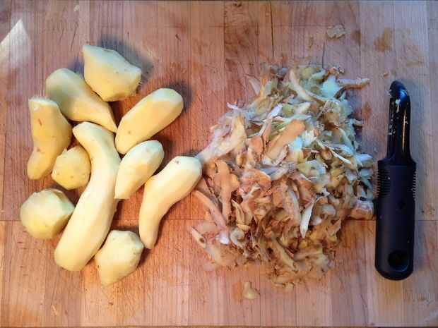 Cáscara y rebanada de jengibre en placas de 1/4 de pulgada. Compost los jengibre peelings para hacer feliz a su jardín.