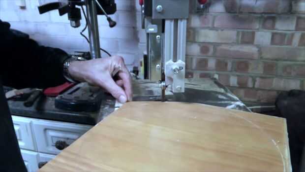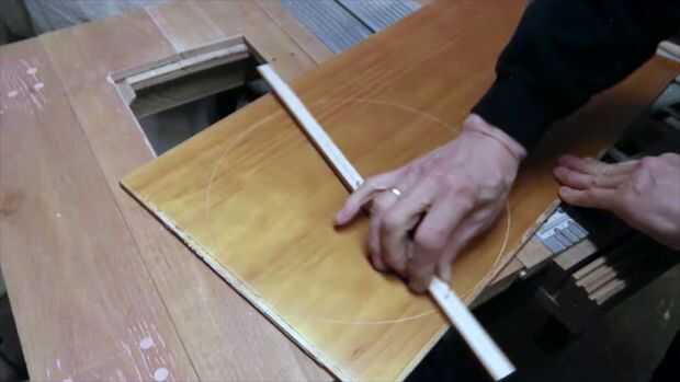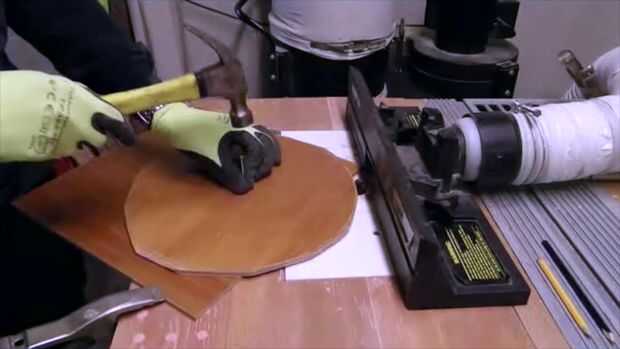 I después de trazado un círculo de diámetro de 12 pulgadas con cada uno de madera y dos pasadores de panel que recortarlo aproximadamente en mi sierra entonces sujeta una pieza de madera había clavado el círculo por el centro en la placa base y enruta un disco perfecto de 12 pulgadas.