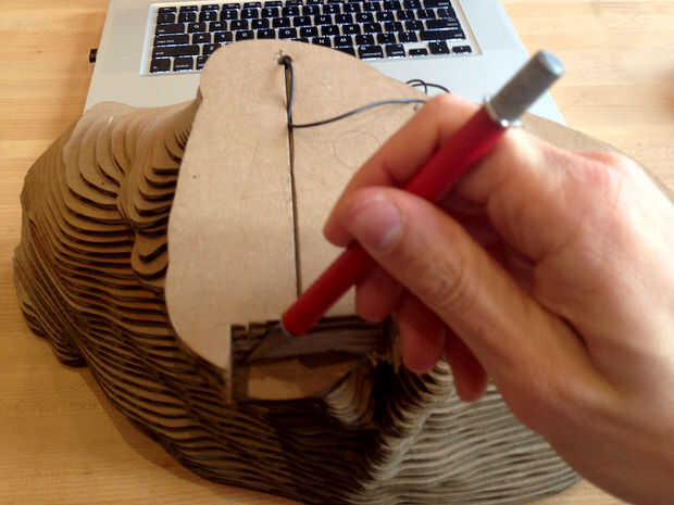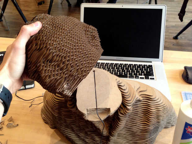 Como ya he mencionado en el paso #4, 123D Make no hace bien con dimensiones críticas. Usted tendrá que cortar material a donde el orador va a ser ubicado. No fuera demasiado, su altavoz no caben cómodamente. Medir el tamaño del conductor y la corte capa por capa. Ser conscientes del cable durante el corte. Pegamento por la parte superior del resto de la cabeza, pero no sujete al cuerpo todavía. Es necesario separar a los cuerpos por lo que se puede cortar con precisión el orificio del altavoz. Una vez que el orador le cabe en la boca, unir ambas mitades.