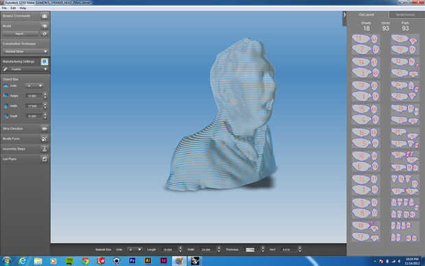 Make 123D e importar el archivo. Elija "Rodajas apiladas" bajo la técnica de construcción. Tipo en las dimensiones de lo cortador del laser que se utiliza. El tamaño de la cama del que usé es de 18 "x 24". Dejé el espesor predeterminado en 0,1700" y corte en 0,010". Seleccione "hacer planes" y el software automáticamente rodajas, expone y números de todas las piezas para el modelo.