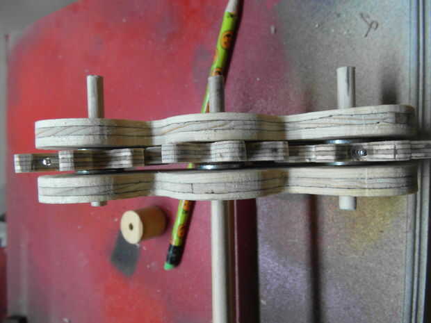 Corte tres engranajes de abedul 1/4 de pulgada, utilizando la plantilla PDF y el método descrito anteriormente, excepto que no hay necesidad de cortar en un ángulo de 10 grados.