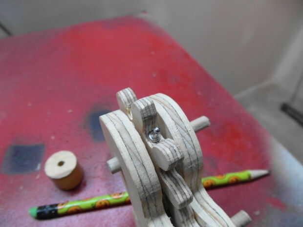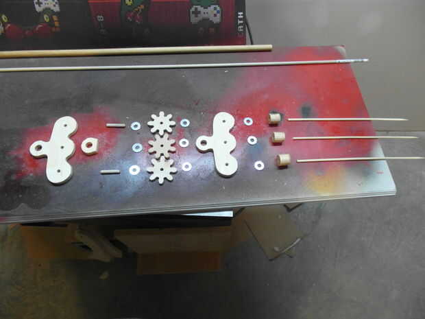 Pegar la caja de engranajes posterior y ficha junto y pegar sobre la espiga de 1/2 pulgada. Añada una arandela en el eje 1/4 de pulgada y pegar el medio engranaje en lugar. Pegue los dos engranajes externos a sus tacos. Deje que seca, asegurándose de que le puede girar el engranaje central de vez en cuando para prevenir accidental pegado a la caja de engranajes posterior. Añadir las arandelas a los dos engranajes externos y poner en su lugar. Poner las arandelas en todos los ejes de tres engranajes, luego pegamento y fije el frente cambios (Asegúrese de obtener la forma correcta, para asegurar que los agujeros están alineados con los agujeros traseros de la caja de engranajes). Revise de nuevo para asegurarse de que todo da vuelta libremente. Cuando eso esté seco, pegamento en los círculos. No terminan de necesidad de las tres arandelas entre los círculos y la caja de engranajes.