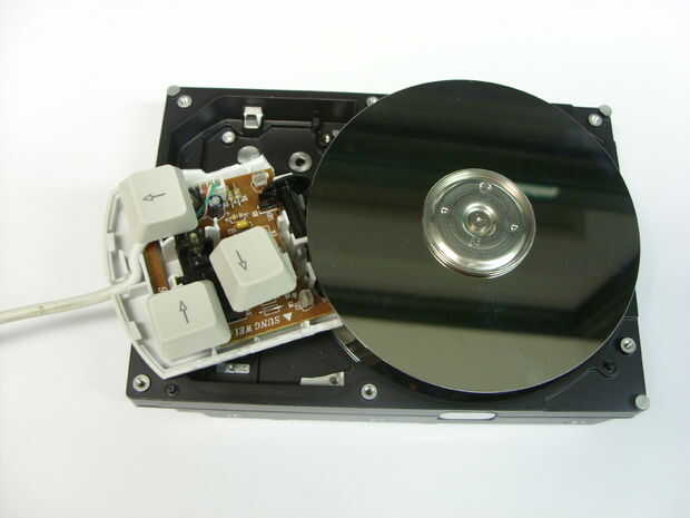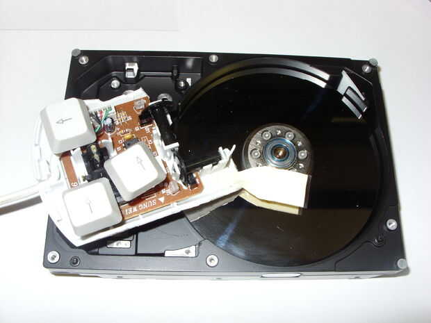 Esto es más complicado. Mi primera idea era hacer un disco con múltiples placas de disco, para sacar las placas de fondo, dejar sólo la placa superior en lugar y montar el ratón las piezas en el caso de la unidad de disco duro con el rodillo debajo del borde de la placa. No se pudo!