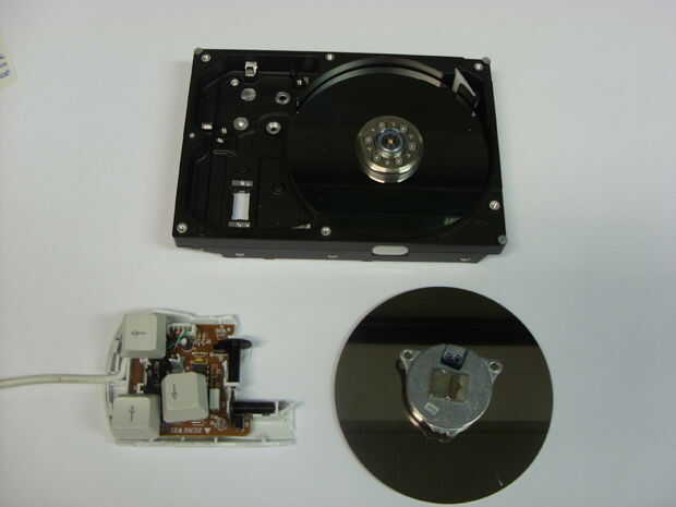 En su lugar, poner las partes del ratón encima de la caja de disco duro (como en la foto) fijándolo en su lugar con tiras adhesivas. Utilice algunos imanes para fijar una segunda placa de disco duro y el motor encima de la primera y su lista.