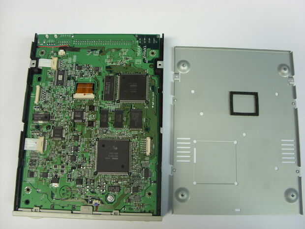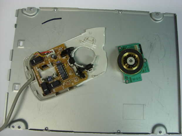 Utilizar una placa de metal de la caja de CD-ROM como una tabla. Poner el CD y el ratón sobre él para encontrar la mejor posición. Colocar el ratón en la placa con cinta adhesiva (o cualquier otro tipo de pegamento). Fijar el motor de giro con los dos imanes en la placa. Ahora agregue el CD y la tapa para el CD. Asegúrese de que el borde del CD está descansando en el rodillo del ratón.