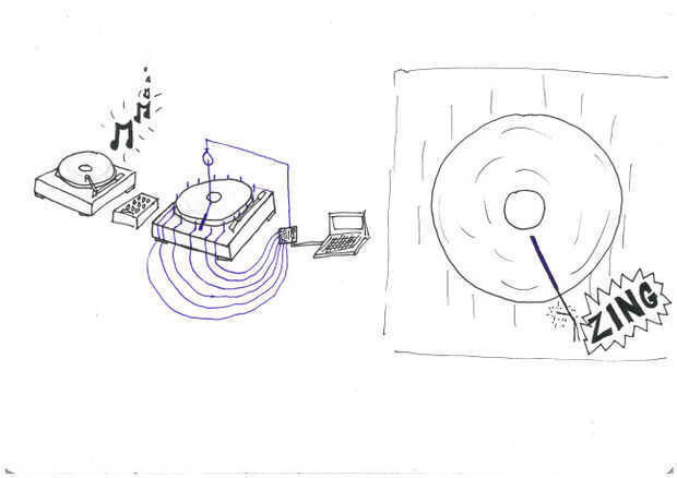 El cable de tierra o suelo será un alambre de cobre que se alimenta desde arriba, pegadas en el disco que gira y toca los pines externos conectando el circuito por una fracción de segundo y accionar las teclas del teclado.