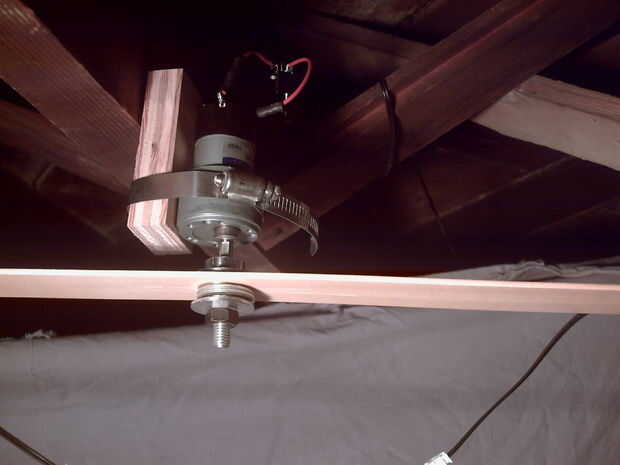 La hoja se une al motor mediante un collar, y el motor se fija al techo con una abrazadera de manguera, como se muestra en la segunda foto.