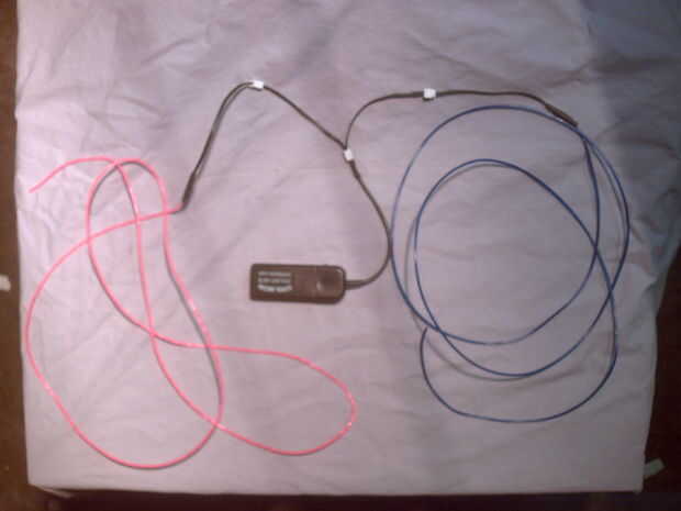 Para este proyecto usé dos pie 5 hebras de alambre EL estándar, que es de 2,3 mm. El alambre brillante, que es de 2,5 mm es realmente sólo un poco demasiado duro para conseguir el efecto deseado. Soldar cables flexibles en los extremos del alambre, había conectado a un conector en Y y había conectado a un controlador de TechnoStrobe.