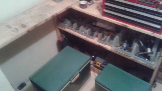 Tomé un tablero del estante extra y colocadas a través de la pared posterior de mi área de trabajo principal. utilizando algunas hieleras viejas para un asiento proporciona almacenamiento adicional