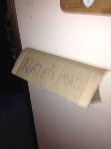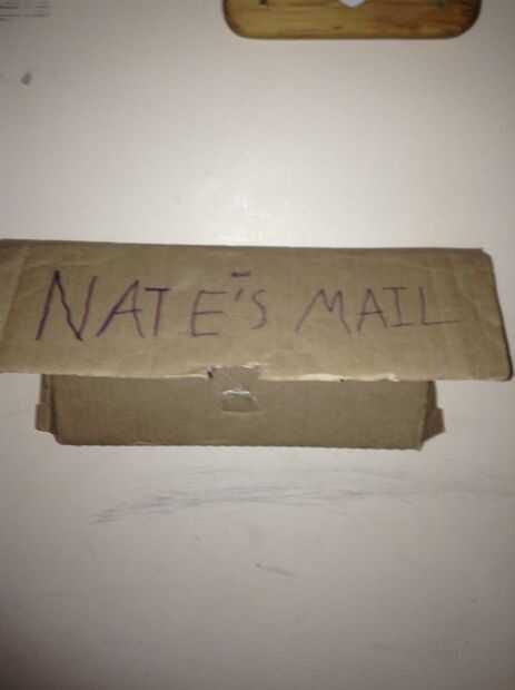 Bien primero, hice esta carpeta contra la pared que sostenga un altavoz. Engalanada como una caja, conseguir alguna tarjeta boared y hacer un doblez hasta cosita que se ve como el anterior. Luego, escribe tu nombre y luego por correo (por ejemplo, Mail de Nate).