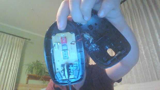 puede utilizar cualquier led te gusta pero me gusta el look de pegamento caliente bajo una luz proporciona un espeluznante luz azul verde color uv. la primera parte de este paso incluye tomar un trozo de la carcasa del ratón, literalmente, lo hice con un taladro y una hoja de sierra rota.