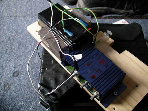 Para instalar la batería, que quería mantener en posición vertical, coloca en la placa de montaje y luego pegado y screwwed piezas de desecho de madera alrededor para mantenerlo en su lugar. No debe subir sobre los trozos de madera porque la batería es pesada, pero puedo correa hacia abajo con un pedazo de bungee si needsbe.