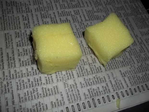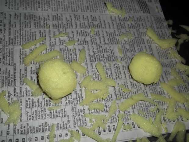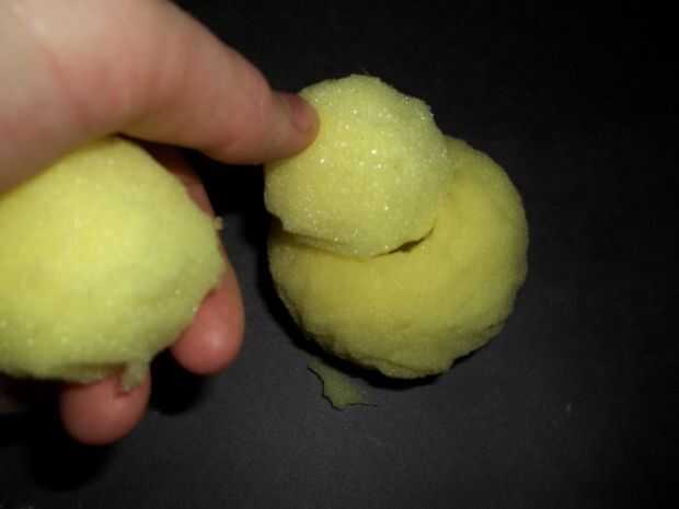 Vuelva al esponja grande bola derecha-lado-hacia fuera y rellenar las otras bolas en él. Asegúrese de que encajan bien - demasiado abultada, que la audiencia sospecha algo. Muy suelta, las bolas de esponja podrían caer fuera de grande.