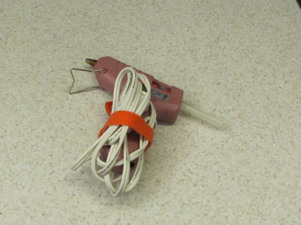Con la pistola de pegamento, poner una pequeña cantidad de pegamento en cada esquina de un lado de la bandeja giratoria