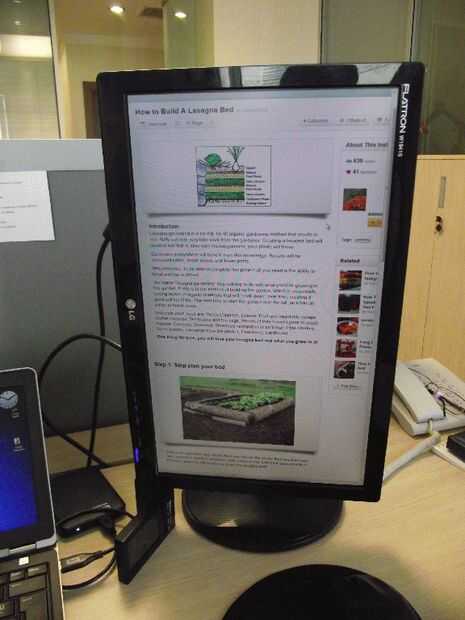 Como no he hecho nada para mantener al monitor vertical, apoyo con mi despertador de escritorio. Nada adecuado lo hará o podría hacer algún tipo de retén para mantener en posición - que usted debe! El monitor se queda horizontal bastante bien así que realmente no necesita nada más.