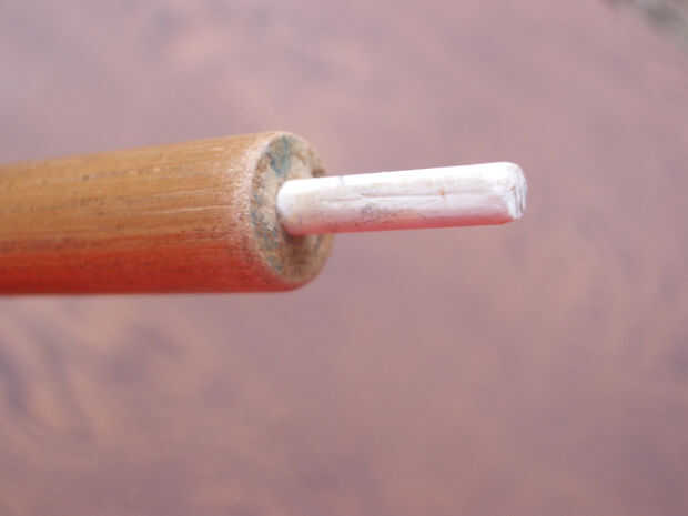 Alternativamente, haga un agujero por el centro de la manija para tomar un palillo. Pegamento en su lugar antes de cortar el extremo que sobresale a la longitud correcta. (Las fotos muestran un eje de una longitud de varilla de fibra de vidrio en lugar de un palo de madera).