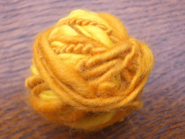 El hilo debe surcando para ser usable. Hilado de la alimentación de dos bolas al mismo tiempo girando la hoja en la dirección opuesta a la dirección de giro. (Es decir S giro hilado necesita ser manejado como torsión Z y viceversa). Usted puede encontrar más fácil hacerlo con la otra mano.