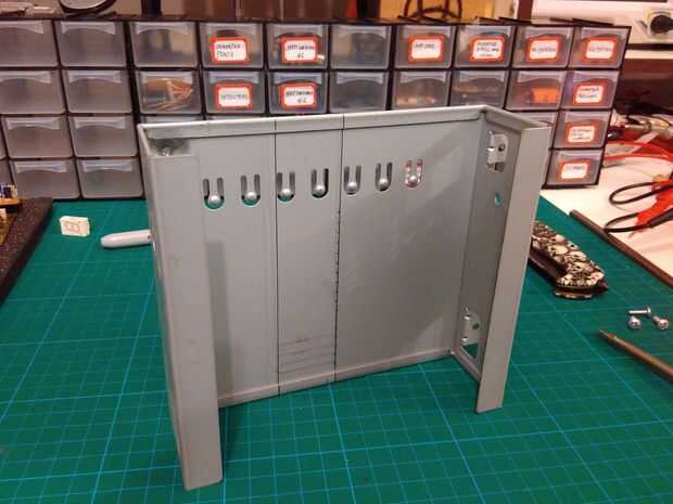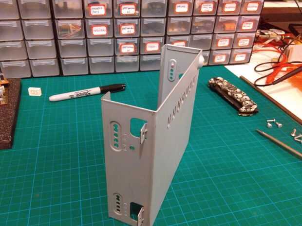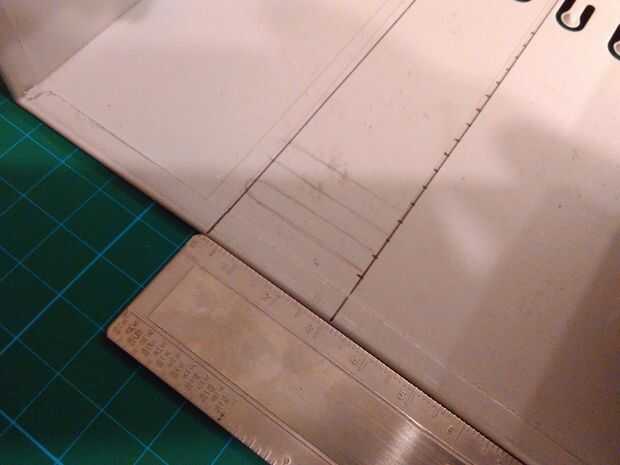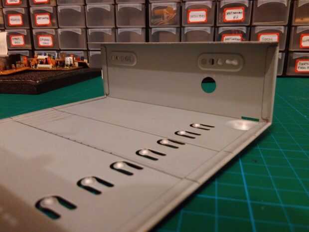 Casi me olvidaba, también es necesario establecer un lugar en donde cortar la bandeja por la mitad (horizontalmente) para que te liberas del otro ángulo. Obviamente estamos usando el lado que tiene los orificios para tornillos.