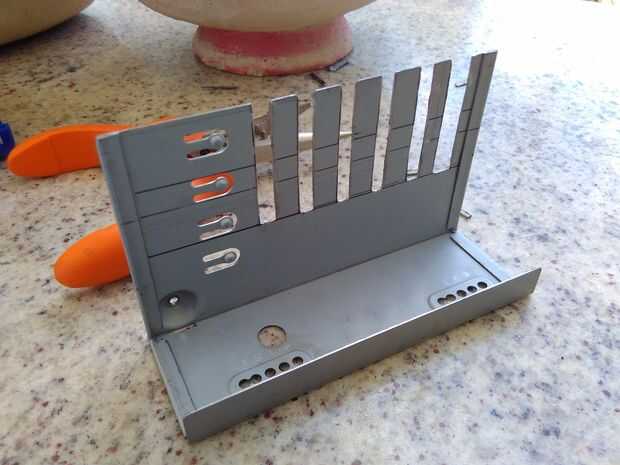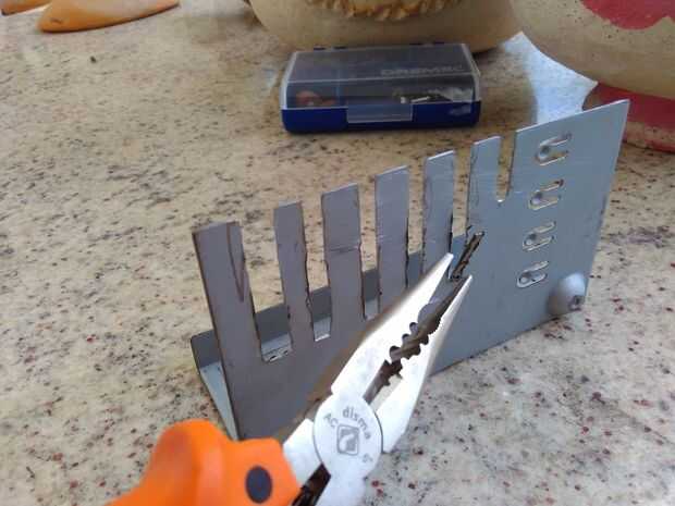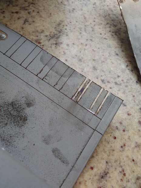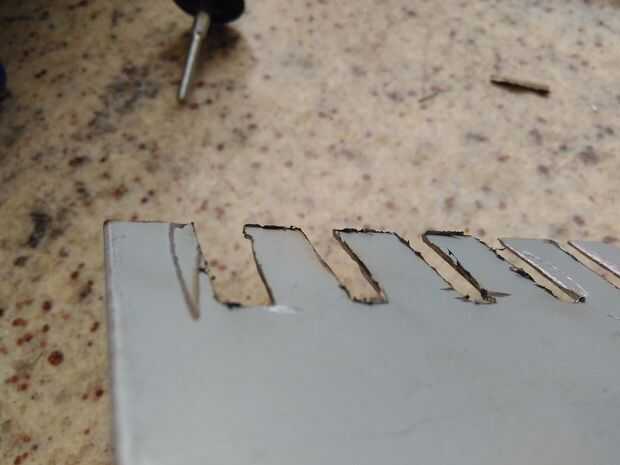Después de que haya terminado con la línea horizontal luego puede comenzar a la apertura de las ranuras. Corte a lo largo de las líneas y una vez que llegar al final de la longitud que has decidido apagar la herramienta, los alicates y luego tirar esa pequeña pestaña abajo.