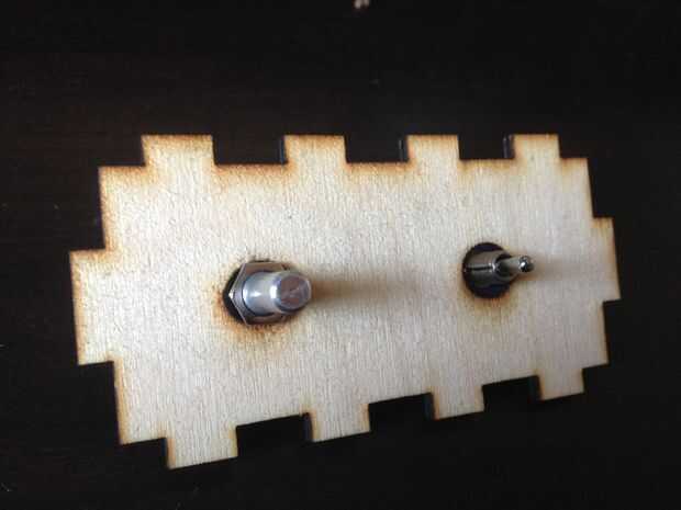 Montar el potenciómetro en la pieza de láser de corte de la madera con los dos agujeros usando la tuerca que vino con él y pone la parte de la perilla del potenciómetro a través de uno de los orificios en el láser de corte de la madera. Apriétela hasta esté en su lugar. Pegamento caliente el interruptor en el otro agujero en la madera.