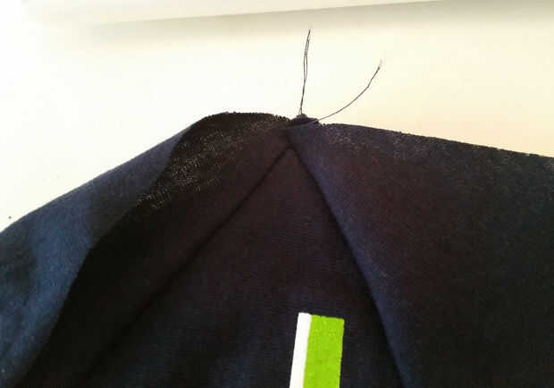 Con la cara exterior hacia dentro, coser a su tejido plano a un lado de la tela de su logo. Luego hacer lo mismo en el otro lado de la pieza del logo con su forma de la tela 3. (Esto garantiza que su cierre cosido a mano será hacia la parte posterior de su fútbol.)