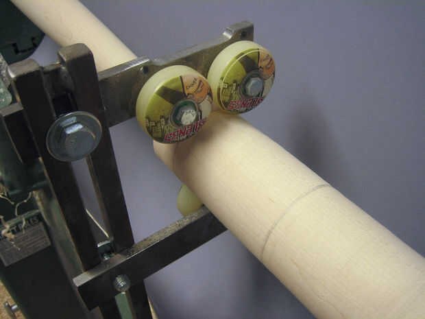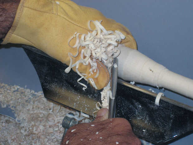 La parte más delicada de convertir a un murciélago es que abajo cerca de la manija, un murciélago es relativamente delgado en comparación con su longitud. Como usted comienza a cuttingtowards el mango, el bate vibrará y hacer que la herramienta rebote y hacer marcas de charla de espiral. La primera cosa a hacer es asegurarse de que las herramientas estén lo más nítidas posible. La segunda cosa a hacer es encontrar una manera de apoyar la acción en el medio. La forma mejor y más conveniente para el experimentado turner es poner su mano derecha detrás del corte y apoyarlo. Esto puede ser un poco intimidante para los novatos y se puede utilizar una tienda comprada o estacionario tienda construida pero me encontrar apoyo desde atrás para ser más versátil y efectiva manera para evitar marcas de charla.