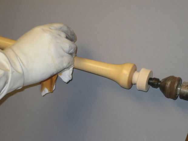 He encontrado una mezcla de aceite y barniz para ser el mejor final. Puede comprar estos tipos de acabados en la ferretería o hacer tu propia mezcla. Generalmente pongo unas capas de acabado mientras el bate está aún montado en el torno. I cargar un trapo con la mezcla y mantener hasta el palo de spinning.