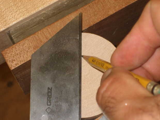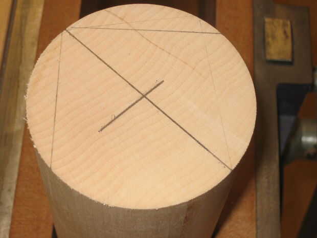 El siguiente paso es marcar el centro del cilindro en ambos lados. Puede utilizar un localizador de centro, si tienes uno. Si no, un buen truco es utilizar un cuadrado para inscribir un ángulo recto dentro del círculo. Dibuje una línea donde las piernas de la Plaza intersecan a la circunferencia. Esa línea pasa por el centro. Hacer lo mismo otra vez después de la Plaza de 90 grados de rotación y la intersección de las dos líneas es el centro.